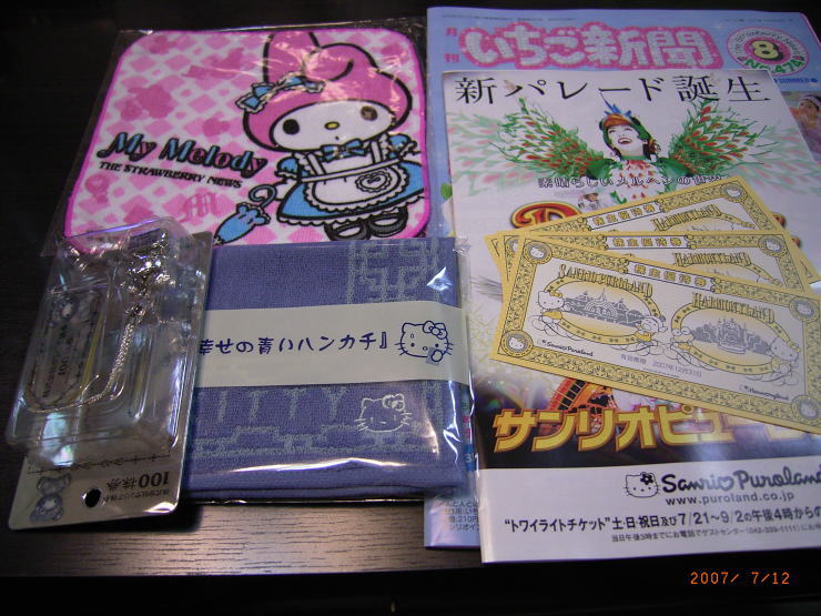 幸せの青いハンカチとプチタオル、ピューロランドの優待券3枚と根付です。